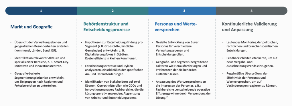 Wie im B2B-Marketing ist auch im B2G-Bereich das adressatengerechte Kommunizieren essenziell. Dafür sollten die wichtigsten Bereiche und Stakeholder identifiziert werden, für die anschließend Buyer Personas entwickelt werden, um sie gezielt in ihren jeweiligen Zielen und Pain Points anzusprechen.